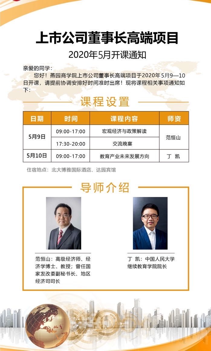 您好!燕园商学院上市公司董事长高端项目于2020年5月9-10日开课,请提前协调安排好时间准时出席!现将课程相关事项通知如