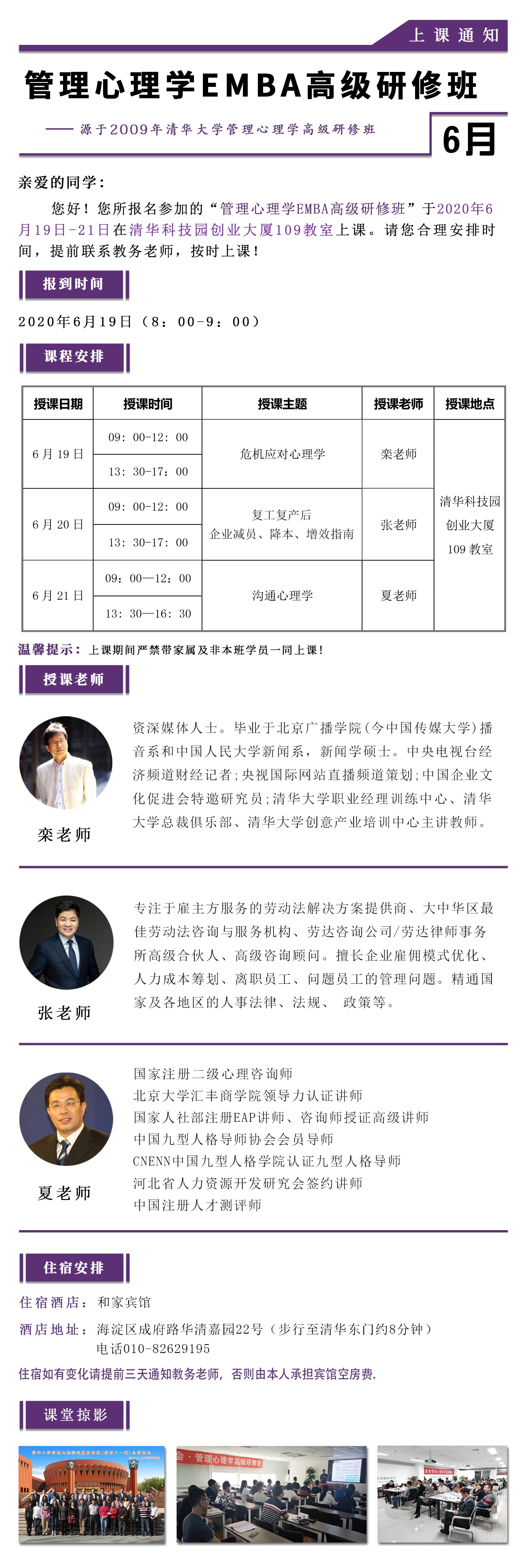 您好!您所报名参加的“管理心理学EMBA高级研修班”于2020年6 月19日-21日在清华科技园创业大厦109教室上课。请您合理安排时间,提前联系教务老师,按时上课!