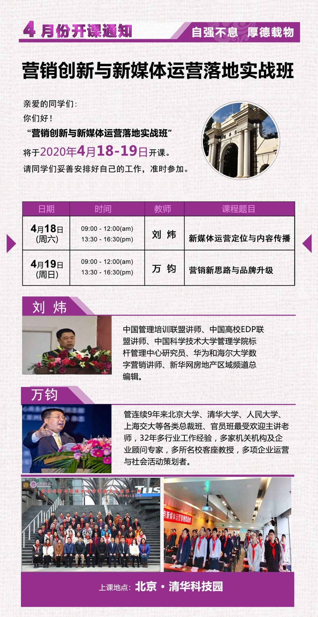 “营销创新与新媒体运营落地实战班” 将于2020年4月18-19日开课。请同学们妥善安排好自己的工作,准时参加