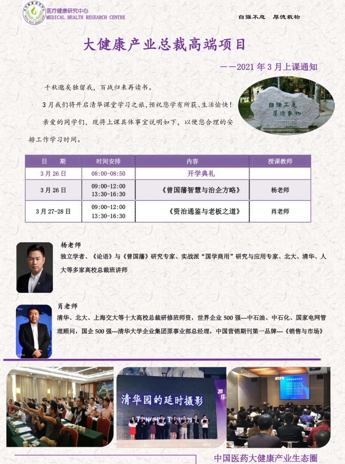 2021年3月26日清华大学大健康产业总裁高端项目开课通知