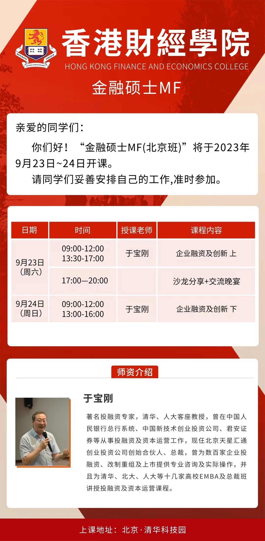 2023年9月23日香港财经学院金融硕士MF上课通知